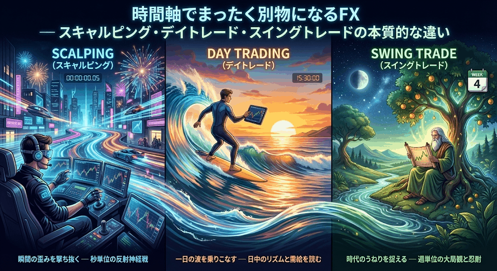 スキャルピング、デイトレード、スイングトレードは、単なる時間の違いではなく、リスク・心理・必要スキルがまったく異なる別の競技です。